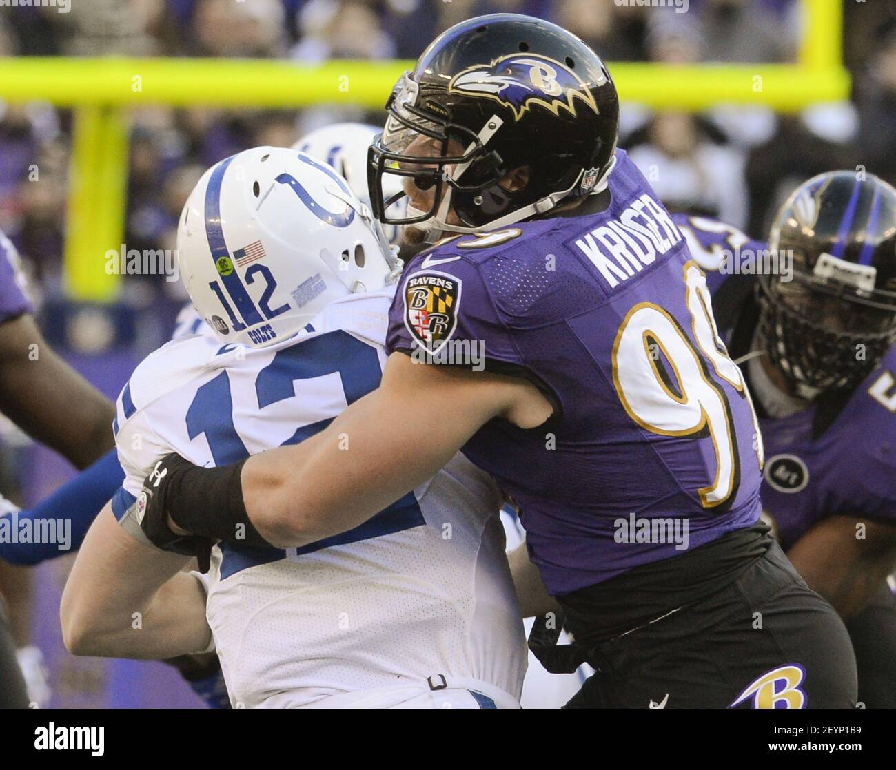 Baltimore Ravens Outside Linebacker Paul Kruger Sacks Indianapolis Colts Quarterback Andrew Luck During The Second Half Of Their Afc Playoff Game In Baltimore Maryland On Sunday January 6 2013 Photo By Doug